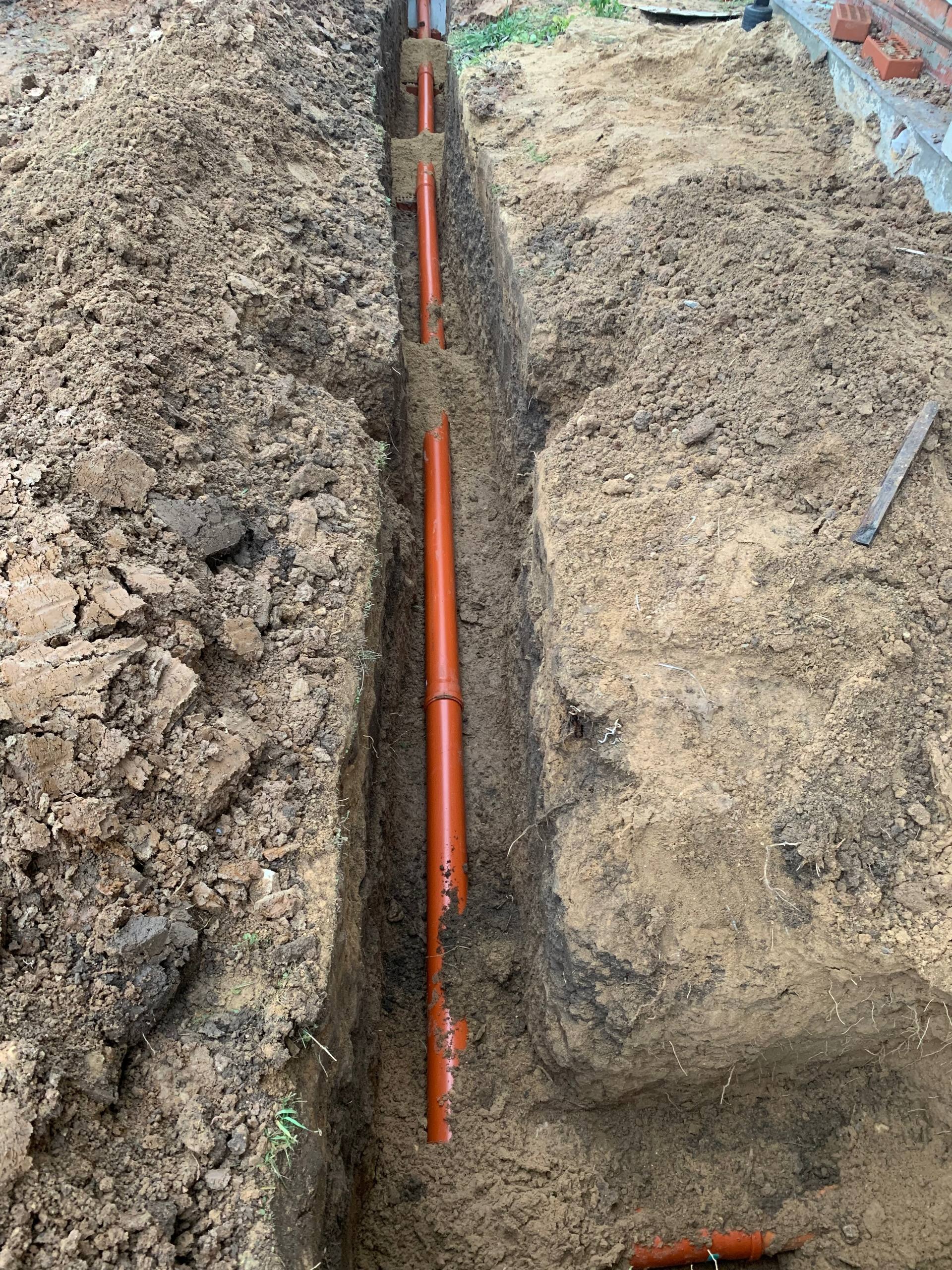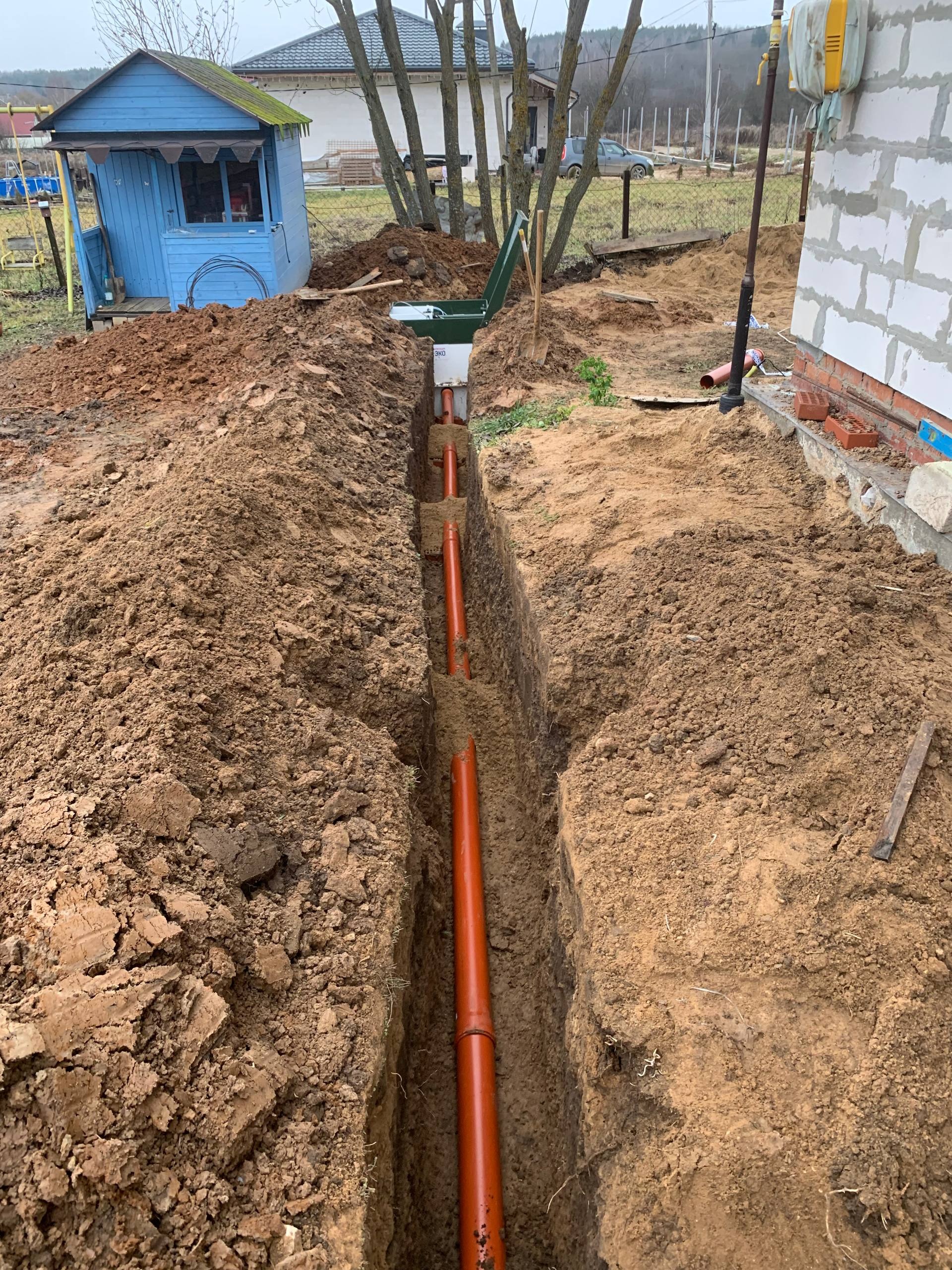 Первым шагом мы провели подготовительные работы — прокопали траншею под пластиковую трубу ПНД (полиэтиленовую) от септика до дома. Глубина траншеи составила один метр, что соответствует нормативным требованиям для защиты коммуникаций от промерзания и механических повреждений. Траншея была выполнена аккуратно, без повреждений окружающей земли и с соблюдением всех правил монтажа.