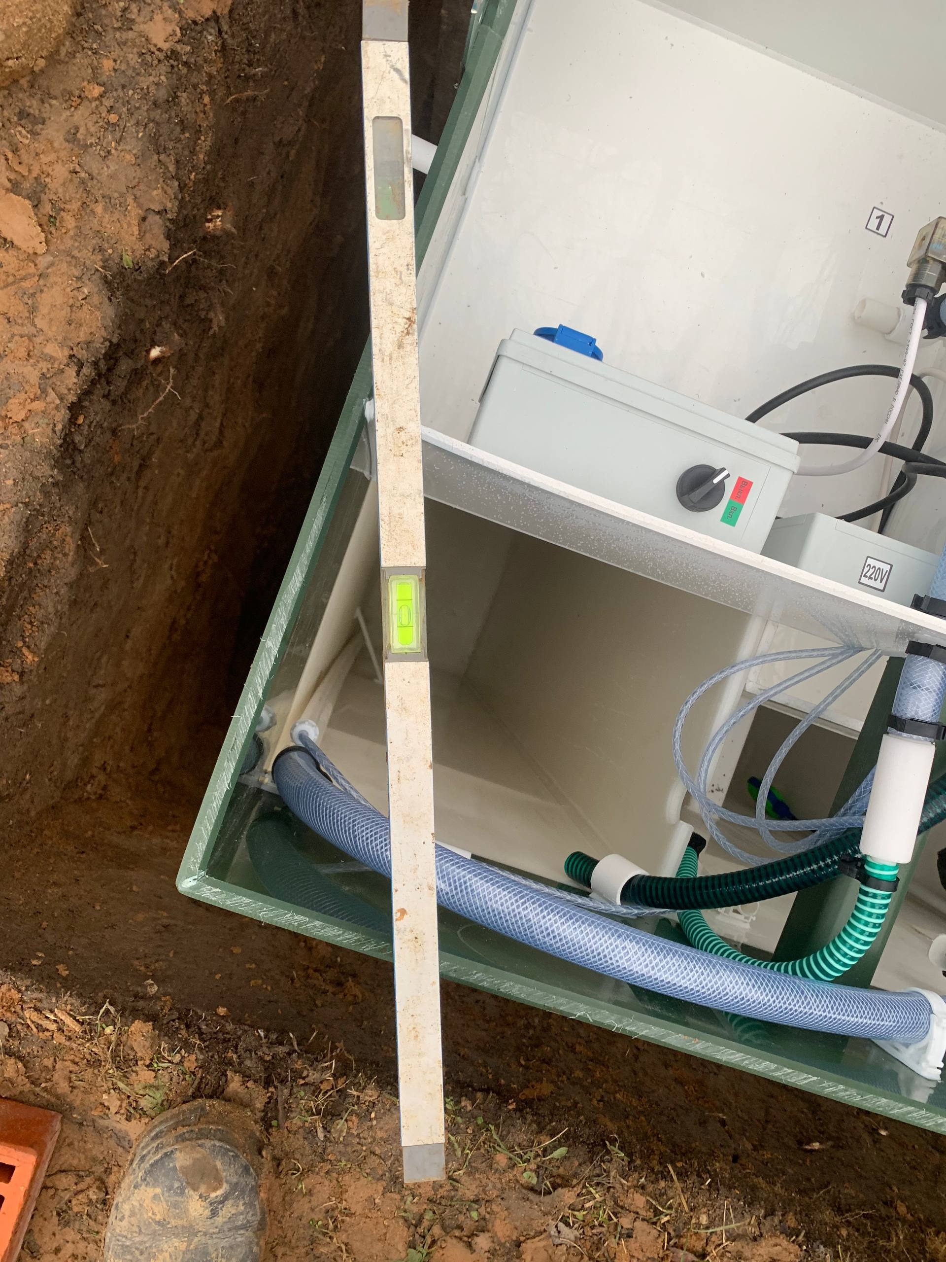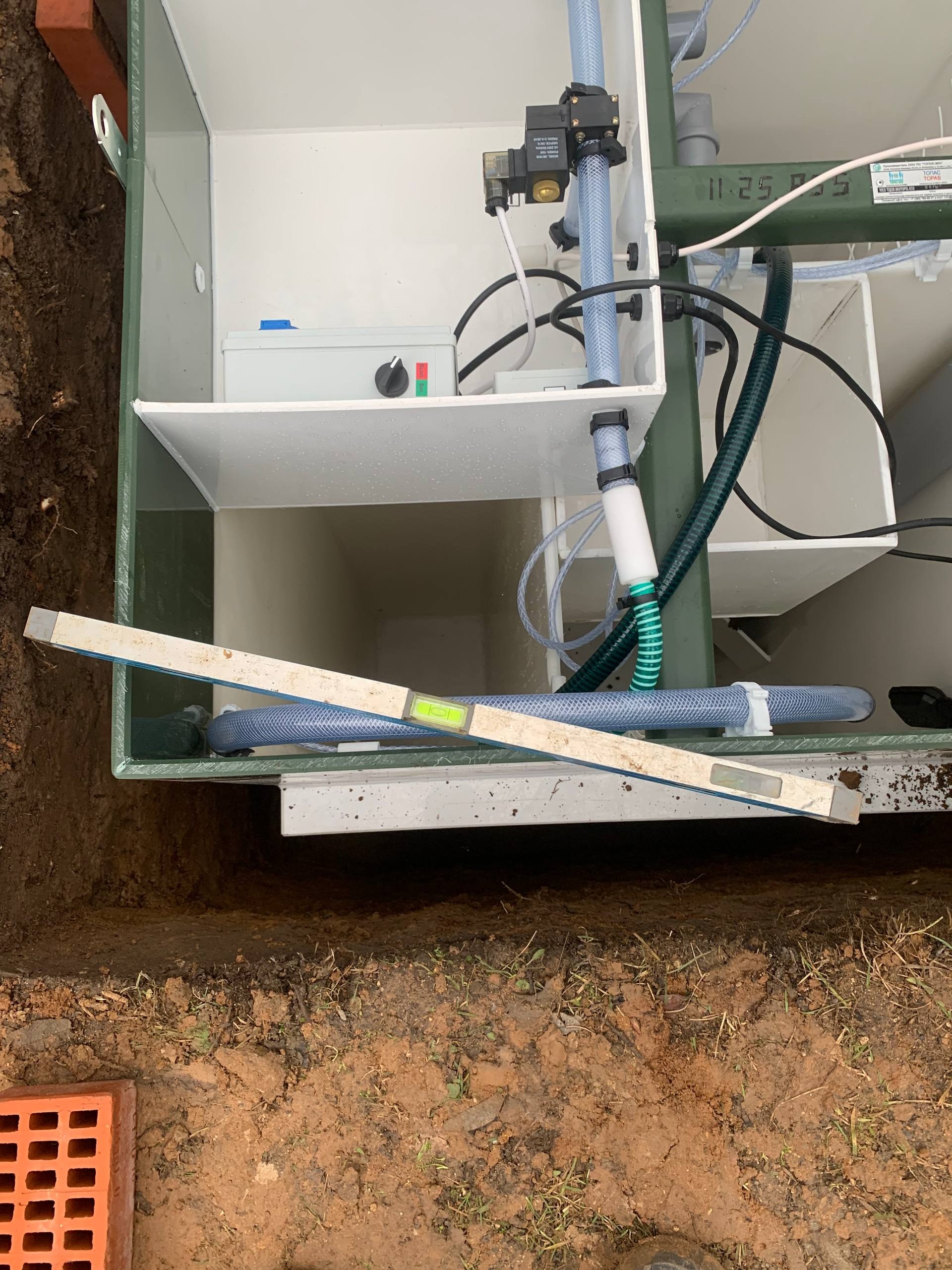 Далее мы установили септик на заданной глубине, строго по уровню, что очень важно для обеспечения правильной работы системы и предотвращения возможных протечек. Установка проводилась с учетом всех технических требований — септик был закреплен надежно, а все соединения выполнены герметично. После этого мы подключили трубу к септику, обеспечив свободный отток и надежную герметичность системы.